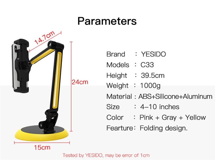 C33 Aluminum Alloy Spring Clip Phone HolderYesido C33 Adjustable Desktop 10 Inch Tablet Monitor Phone Holder | 360 Degree Clamp Tablet Phone Holder.HPS offer 0.5J/1J/2J/3.5J/4.8J(AC/AC&DC/SOLAR).FeaturesAluminum Alloy Spring Clip Holder.flexible clamp arm.Home using.C33 Aluminum Alloy Spring Clip Phone HolderParameterBrand:YesidoFixing method:Aluminum Spring ClipPhone HolderMode:C33Apply to:HomeMaterial:ABS + Aluminum AlloyApplicable items:Mobile PhoneOutput:G.W:200GC33 Aluminum Alloy Spring Clip Phone HolderVideoProduct Installation Video1.Assemble the holder and the base.2.Assemble the holder on to the Table.3. Put the mobile phone on and start using.Product CompositionAluminum Alloy Spring Clip Phone Holder.C33 Aluminum Alloy Spring Clip Phone HolderDetailsFAQ1. what is the delivery time of theC33 Aluminum Alloy Spring Clip Phone Holder?Usually, the delivery time will be within 5-7 days.2. What you can do in OEM ?We can help to design the customer’s logo on the products, and help to design the product packaging according to our standard.3. How long is your warranty time?from the selling date, last for 1 year.
