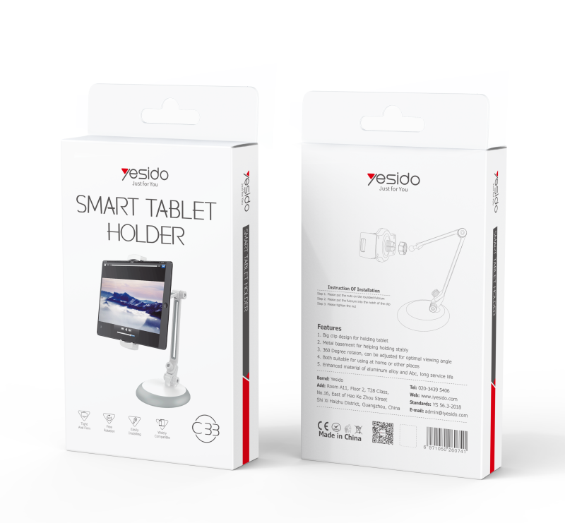 Short description: C33 Aluminum Alloy Spring Clip Phone HolderYesido C33 Adjustable Desktop 10 Inch Tablet Monitor Phone Holder | 360 Degree Clamp Tablet Phone Holder.HPS offer 0.5J/1J/2J/3.5J/4.8J(AC/AC&DC/SOLAR).FeaturesAluminum Alloy Spring Clip Holder.flexible clamp arm.Home using.C33 Aluminum Alloy Spring Clip Phone HolderParameterBrand:YesidoFixing method:Aluminum Spring ClipPhone HolderMode:C33Apply to:HomeMaterial:ABS + Aluminum AlloyApplicable items:Mobile PhoneOutput:G.W:200GC33 Aluminum Alloy Spring Clip Phone HolderVideoProduct Installation Video1.Assemble the holder and the base.2.Assemble the holder on to the Table.3. Put the mobile phone on and start using.Product CompositionAluminum Alloy Spring Clip Phone Holder.C33 Aluminum Alloy Spring Clip Phone HolderDetailsFAQ1. what is the delivery time of theC33 Aluminum Alloy Spring Clip Phone Holder?Usually, the delivery time will be within 5-7 days.2. What you can do in OEM ?We can help to design the customer’s logo on the products, and help to design the product packaging according to our standard.3. How long is your warranty time?from the selling date, last for 1 year.