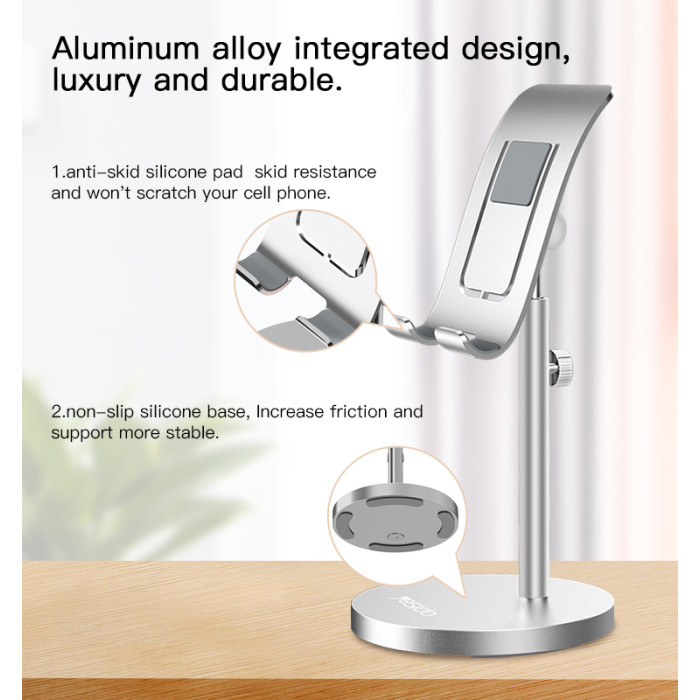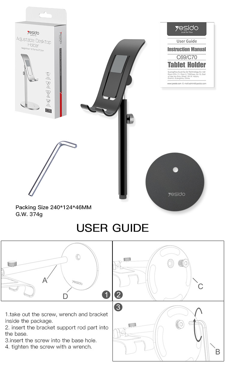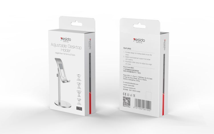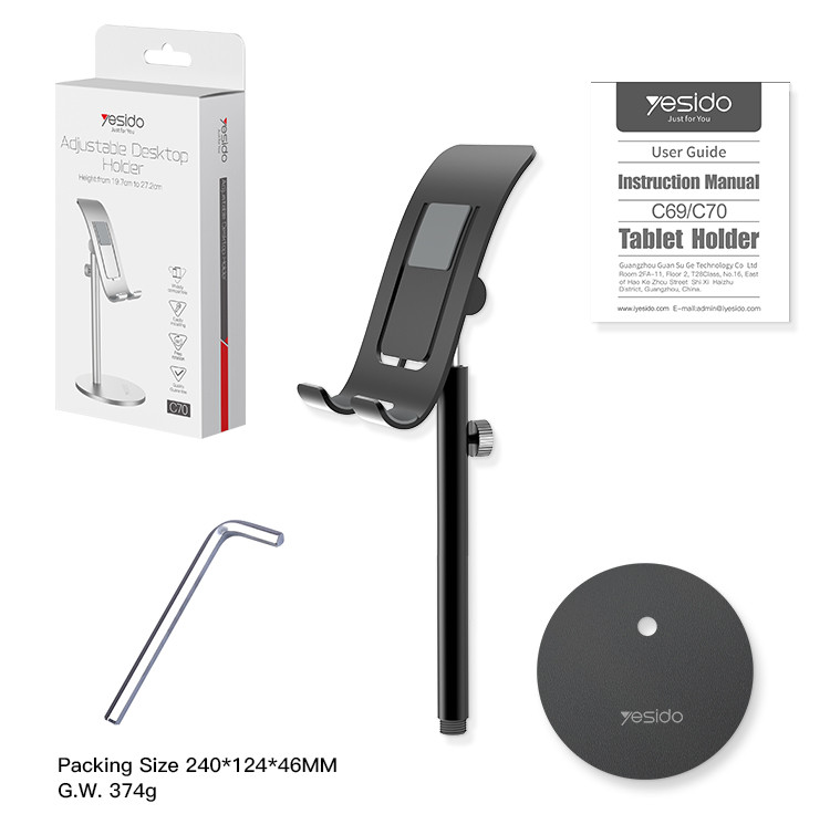 C70 Tablet/Phone HolderYesido C70 Universal Fold Flexible Adjustable Telescopic Phone Holder | Table Phone Holdert.HPS offer 0.5J/1J/2J/3.5J/4.8J(AC/AC&DC/SOLAR).FeaturesUniversal table using.ABS + Aluminum Alloy.Gravity Sensor Phone Holder.telescopic support.C70 Tablet/Phone HolderParameterBrand:YesidoFixing method:Tablet/ Phone HolderMode:C70Apply to:Table/FloorMaterial:ABS + Aluminum AlloyApplicable items:Mobile PhoneOutput:G.W:200GC70 Tablet/Phone HolderVideoProduct Installation Video1.Assemble the holder and the base.2.Assemble the holder on to the table/floor.3. Put the mobile phone on and start using.Product CompositionTablet/Phone Holder.C70 Tablet/Phone HolderDetailsFAQ1. what is the delivery time of theC70 Tablet/Phone Holder?Usually, the delivery time will be within 5-7 days.2. What you can do in OEM ?We can help to design the customer’s logo on the products, and help to design the product packaging according to our standard.3. How long is your warranty time?from the selling date, last for 1 year.