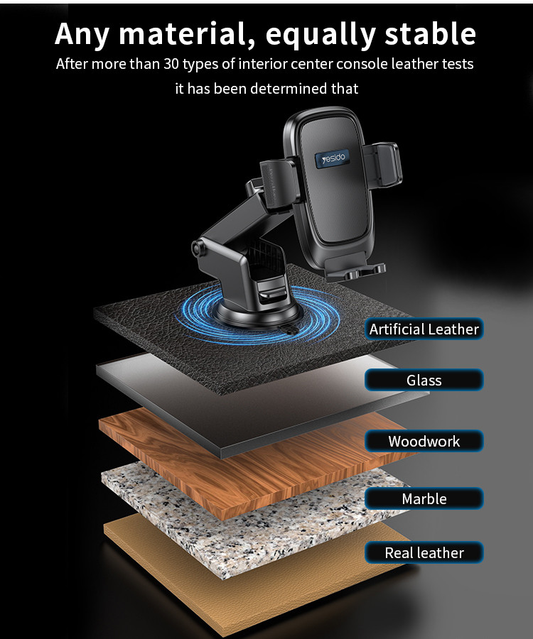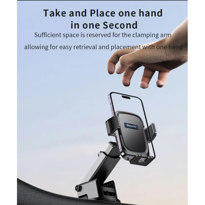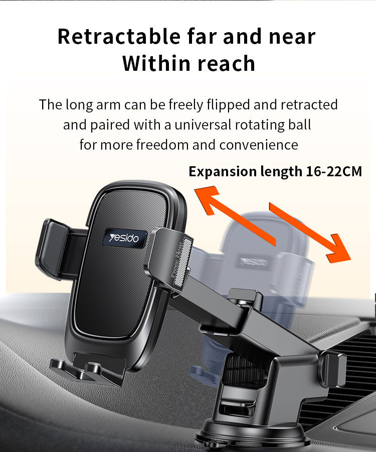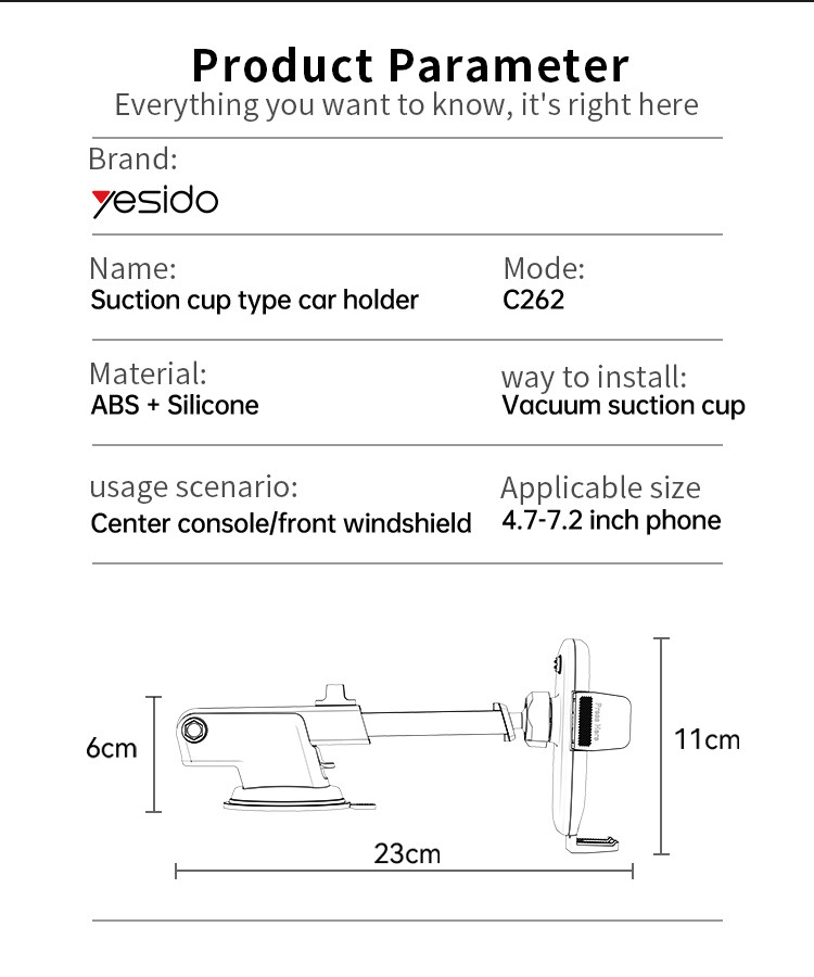 C262 Dashboard Car Phone HolderNew Product Suction Cup Flexible Adjustment Long Arm Phone Holder Universal Dashboard Car HolderFeaturesPrivate Mold.Goose Silicone Anti-slipAuto extended clipABS Materialuniversal for all mobile phoneC262 Dashboard Car Phone HolderParameterBrand:YesidoFixing method:Suction cupMode:C262Apply to:Dashboard/ Windshield / Home flat surfaceMaterial:Abs+pc+tpuApplicable items:mobile phoneOutput:n/AG.W:262GC262 Dashboard Car Phone HolderVideoProduct Installation Video1. Assemble the holder and the suction cup base2. Release the suction cup and peel of the layer3. Press the suction cup on to car dashboard / windshield4. Close the Suction Cup Button and leave it alone for around 6~8 hours5. Press the switch on the back to open the clip6. put the mobile phone on and start usingProduct CompositionHolder HeadSucntion Cup BaseC262 Dashboard Car Phone HolderDetailsFAQ1. what is the delivery time of theC262 Dashboard Car Phone Holder?Usually, the delivery time will be within 5-7 days.2. What you can do in OEMWe can help to design the customer’s logo on the products, and help to design the product packaging according to our standard3. How long is your warranty time?from the selling date, last for 1 year.
