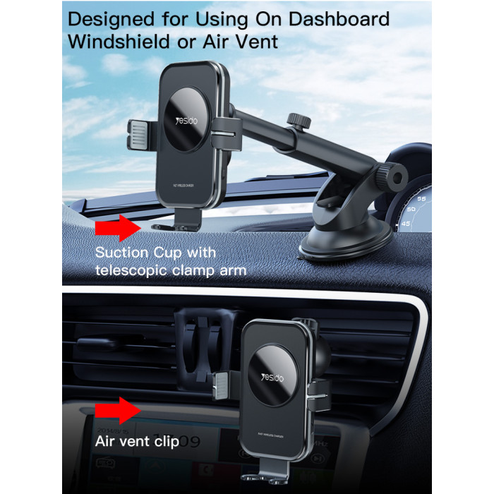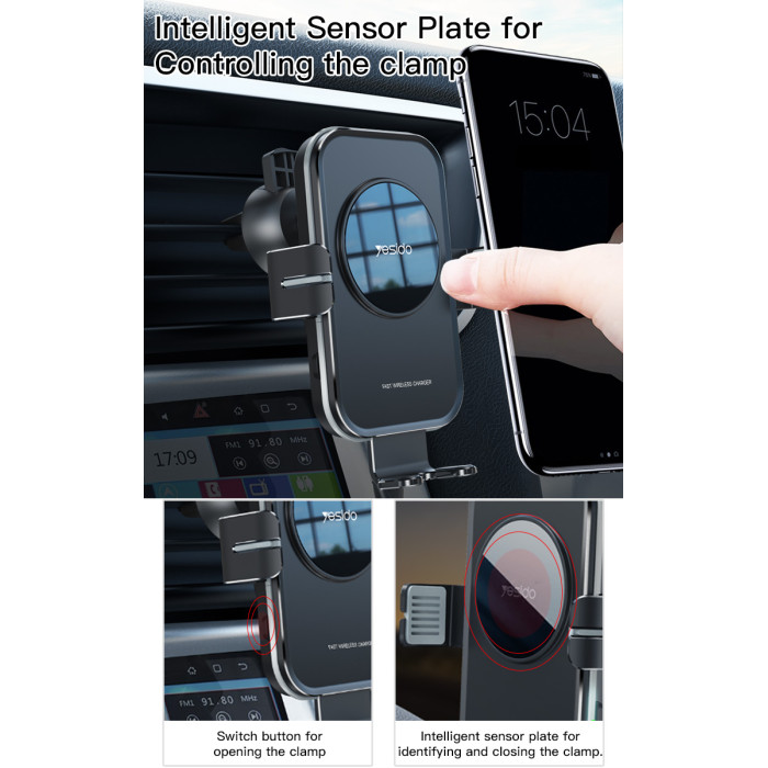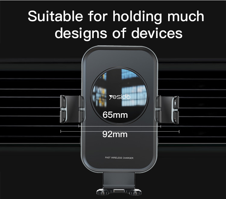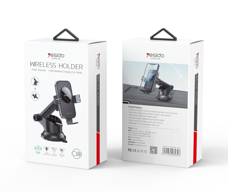 C118 15W Wireless Charging Phone HolderYesido C118 Suction Cup 15w Qi Wireless Charger Holder Factory Custom Car Phone Holder Wireless Charging.HPS offer 0.5J/1J/2J/3.5J/4.8J(AC/AC&DC/SOLAR).Features15W Wireless charging holder.Touching switch.with suction cup and Airvent clip.C118 15W Wireless Charging Phone HolderParameterBrand:YesidoFixing method:Wireless Charging Phone HolderMode:C118Apply to:Air Vent/Center Console/DashboardMaterial:ABS+AluminiumApplicable items:Mobile PhoneOutput:G.W:331GC118 15W Wireless Charging Phone HolderVideoProduct Installation Video1.Assemble the holder and the base.2.Assemble the holder on to theAir Vent/Center Console/Dashboard.3. put the mobile phone on and start using.Product CompositionWireless Charging Phone HolderC118 15W Wireless Charging Phone HolderDetailsFAQ1. what is the delivery time of theC118 15W Wireless Charging Phone Holder?Usually, the delivery time will be within 5-7 days.2. What you can do in OEM ?We can help to design the customer’s logo on the products, and help to design the product packaging according to our standard3. How long is your warranty time?from the selling date, last for 1 year.