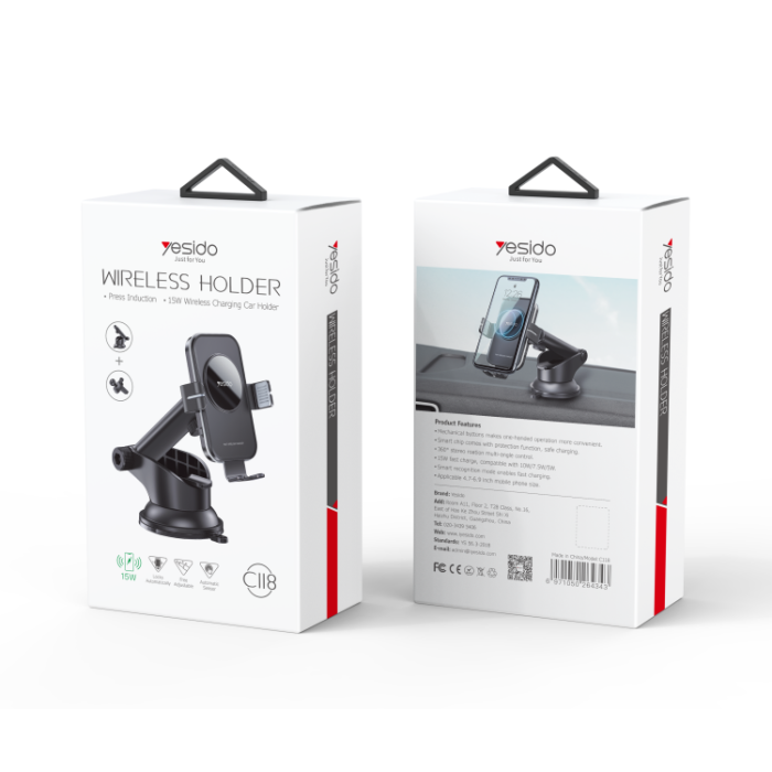 Short description: C118 15W Wireless Charging Phone HolderYesido C118 Suction Cup 15w Qi Wireless Charger Holder Factory Custom Car Phone Holder Wireless Charging.HPS offer 0.5J/1J/2J/3.5J/4.8J(AC/AC&DC/SOLAR).Features15W Wireless charging holder.Touching switch.with suction cup and Airvent clip.C118 15W Wireless Charging Phone HolderParameterBrand:YesidoFixing method:Wireless Charging Phone HolderMode:C118Apply to:Air Vent/Center Console/DashboardMaterial:ABS+AluminiumApplicable items:Mobile PhoneOutput:G.W:331GC118 15W Wireless Charging Phone HolderVideoProduct Installation Video1.Assemble the holder and the base.2.Assemble the holder on to theAir Vent/Center Console/Dashboard.3. put the mobile phone on and start using.Product CompositionWireless Charging Phone HolderC118 15W Wireless Charging Phone HolderDetailsFAQ1. what is the delivery time of theC118 15W Wireless Charging Phone Holder?Usually, the delivery time will be within 5-7 days.2. What you can do in OEM ?We can help to design the customer’s logo on the products, and help to design the product packaging according to our standard3. How long is your warranty time?from the selling date, last for 1 year.