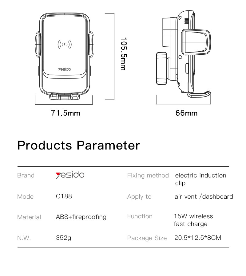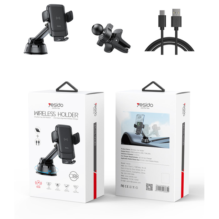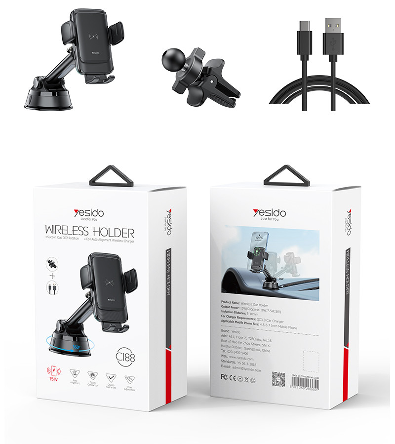 C188 15W Wireless Charging Phone HolderYesido C188 Car Phone Holder | 15W Fast Charge Automatic Induction Alignment Universal Cradle Car Charger.HPS offer 0.5J/1J/2J/3.5J/4.8J(AC/AC&DC/SOLAR).Features15W Wireless charging.Auto adjust place of wireless charging and memoried.With capacitance can hold partial electricity for moment.Touching sense button with suction cup and air vent clip.C188 15W Wireless Charging Phone HolderParameterBrand:YesidoFixing method:Wireless Charging  Phone HolderMode:C188Apply to:Air Vent/ DashboardMaterial:ABS + Fire ProofingApplicable items:Mobile PhoneOutput:G.W:352GC188 15W Wireless Charging Phone HolderVideoProduct Installation Video1.Assemble the holder and the base.2.Assemble the holder on to the air vent / dashboard.3. Put the mobile phone on and start using.Product Composition15W Wireless Charging Phone Holder.C188 15W Wireless Charging Phone HolderDetailsFAQ1. what is the delivery time of theC188 15W Wireless Charging Phone Holder?Usually, the delivery time will be within 5-7 days.2. What you can do in OEM ?We can help to design the customer’s logo on the products, and help to design the product packaging according to our standard.3. How long is your warranty time?from the selling date, last for 1 year.