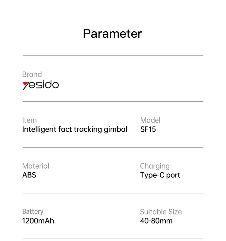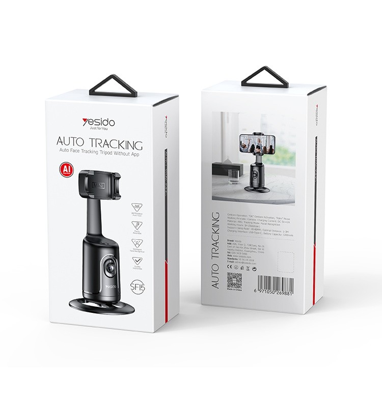 Yesido SF15 Auto Face tracking Gimbal Selfie StickYesido SF15 AI Intelligent Auto Face Tracking Phone Holder Gimbal Stabilizer Phone Tripod Selfie Stick.Features360° auto face tracking.Built-in Camera.Built-in iFly Tek AI Chip.Battery: 1200mAh.Support Gesture Start or pause.Yesido SF15 Auto Face tracking Gimbal Selfie StickParameterBrand:YesidoFixing method:SF15 Auto Face tracking Gimbal Selfie StickMode:SF15Apply to:Mobile PhoneMaterial:ABSBattery:1200mAhPower Output:G.W:361GYesidoSF15 Auto Face tracking Gimbal Selfie StickVideoProduct Installation Video1.Turn on theSF15.2.The phone Bluetooth connects to the product.3.And then it’s ready to use.Product CompositionYesidoSF15 Auto Face tracking Gimbal Selfie StickYesidoSF15 Auto Face tracking Gimbal Selfie StickDetailsFAQ1. what is the delivery time of theYesidoSF15 Auto Face tracking Gimbal Selfie Stick?Usually, the delivery time will be within 5-7 days.2. What you can do in OEM ?We can help to design the customer’s logo on the products, and help to design the product packaging according to our standard3. How long is your warranty time?from the selling date, last for 1 year.