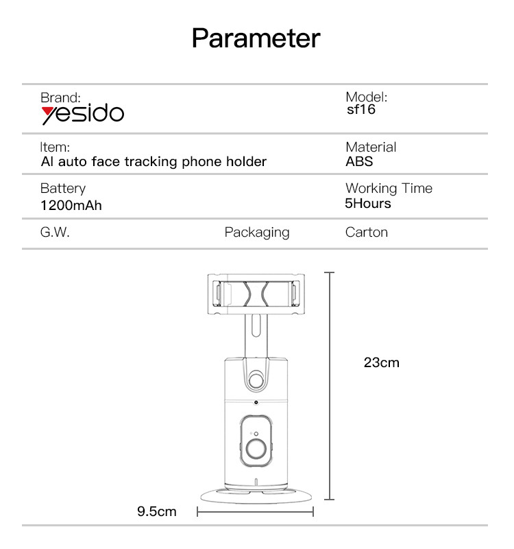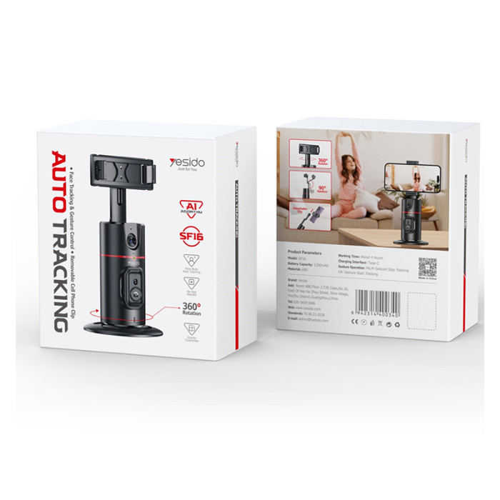 Yesido SF16 Auto Face tracking Gimbal Selfie StickYesido SF16 Auto Face Tracking Tripod 360 Removable Design With Remote Controller Built-in With 1200mAh Battery Holder.Features360° auto face tracking.Built-in Camera.Built-in iFly Tek AI Chip.Battery: 1200mAh.Support Gesture Start or pause.Yesido SF16 Auto Face tracking Gimbal Selfie StickParameterBrand:YesidoFixing method:SF16 Auto Face tracking Gimbal Selfie StickMode:SF16Apply to:Mobile PhoneMaterial:ABSBattery:1200mAhPower Output:G.W:361GYesidoSF16 Auto Face tracking Gimbal Selfie StickVideoProduct Installation Video1.Turn on theSF16.2.The phone Bluetooth connects to the product.3.And then it’s ready to use.Product CompositionYesidoSF16 Auto Face tracking Gimbal Selfie StickYesidoSF16 Auto Face tracking Gimbal Selfie StickDetailsFAQ1. what is the delivery time of theYesidoSF16 Auto Face tracking Gimbal Selfie Stick?Usually, the delivery time will be within 5-7 days.2. What you can do in OEM ?We can help to design the customer’s logo on the products, and help to design the product packaging according to our standard3. How long is your warranty time?from the selling date, last for 1 year.