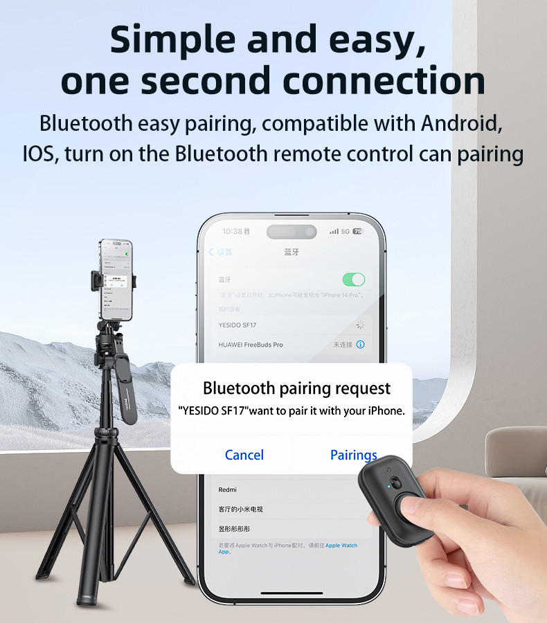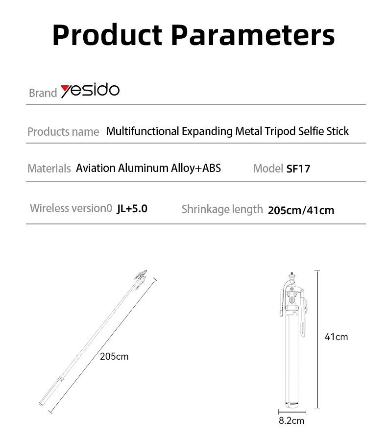 Yesido SF17 Tripod Leg Selfie StandYesido SF17 Multifunctional 360 Handheld Panoramic Shot Selfie Stick 2.05M Bluetooth Remote Shooting Aluminum Alloy Expanding Tripod.FeaturesAluminum Alloy +ABS.Max 2.meters.With BT remote control.As accessories to mobile/face tracking gimbal / Camera.Yesido SF17 Tripod Leg Selfie StandParameterBrand:YesidoFixing method:SF17 Tripod Leg Selfie StandMode:SF17Apply to:Mobile PhoneMaterial:ABS + Aluminum AlloyLength:205cmPower Output:G.W:743GYesidoSF17 Tripod Leg Selfie StandVideoProduct Installation Video1.Turn on theSF17.2.The phone Bluetooth connects to the product.3.And then it’s ready to use.Product CompositionYesidoSF17 Tripod Leg Selfie StandYesidoSF17 Tripod Leg Selfie StandDetailsFAQ1. what is the delivery time of theYesidoSF17 Tripod Leg Selfie Stand?Usually, the delivery time will be within 5-7 days.2. What you can do in OEM ?We can help to design the customer’s logo on the products, and help to design the product packaging according to our standard3. How long is your warranty time?from the selling date, last for 1 year.