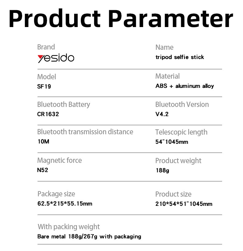 SF19 Magnetic Tripod Leg Selfie StandYesido SF19 360 Free Adjustment Aluminum Alloy Multi-purpose Magnetic Tripod Leg Selfie Stick With Two Magnetizing Rings.Features.ABS+AluminumAlloy+N52 Magnets .With triple leg stand.BT : JL+4.2.Length: 406-1055MM.With Remote Control.With battery: CR1632.SF19 Magnetic Tripod Leg Selfie StandParameterBrand:YesidoFixing method:SF19 Magnetic Tripod Leg Selfie StandMode:SF19Apply to:Mobile PhoneMaterial:ABS + Aluminum alloyBattery:450mAhPower Output:G.W:268GSF19 Magnetic Tripod Leg Selfie StandParameterProduct CompositionYesido SF19 Magnetic Tripod Leg Selfie Stand1. Turn on the SF19.2.The phone Bluetooth connects to the product.3.And then it’s ready to use.SF19 Magnetic Tripod Leg Selfie StandDetailsFAQ1. what is the delivery time of theYesido SF19 Magnetic Tripod Leg Selfie Stand?Usually, the delivery time will be within 5-7 days.2. What you can do in OEM ?We can help to design the customer’s logo on the products, and help to design the product packaging according to our standard3. How long is your warranty time?from the selling date, last for 1 year.