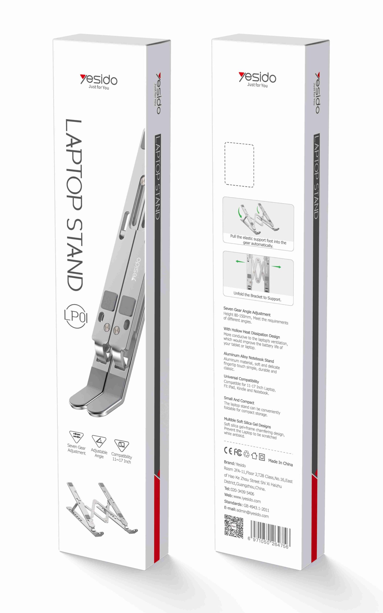 Yesido LP01Aluminum AlloyLaptop HolderFolding portable Aluminum Alloy Computer laptop using mobile phone tablet stand holderFeaturesFor Laptop (all size)For Tablet (all size)Aluminum Alloy Materialuniversal for all laptopYesidoLP01Aluminum AlloyLaptop HolderParameterBrand:YesidoFixing method:Directly useMode:LP01Apply to:Flat SurfaceMaterial:Aluminum AlloyApplicable items:LaptopOutput:n/AG.W:278GYesidoLP01Aluminum AlloyLaptop HolderVideoProduct Installation Video1.Lay flat on the flat Surface2.Unfold it at the right Angle3.Put the laptop on the product and use itYesidoLP01Aluminum AlloyLaptop HolderDetailsFAQ1. what is the delivery time of theYesidoLP01Aluminum AlloyLaptop Holder?Usually, the delivery time will be within 5-7 days.2. What you can do in OEMWe can help to design the customer’s logo on the products, and help to design the product packaging according to our standard3. How long is your warranty time?from the selling date, last for 1 year.