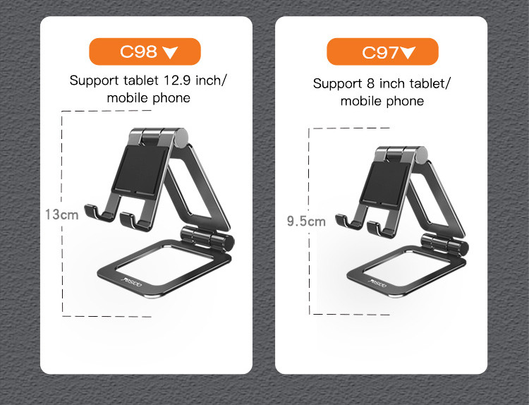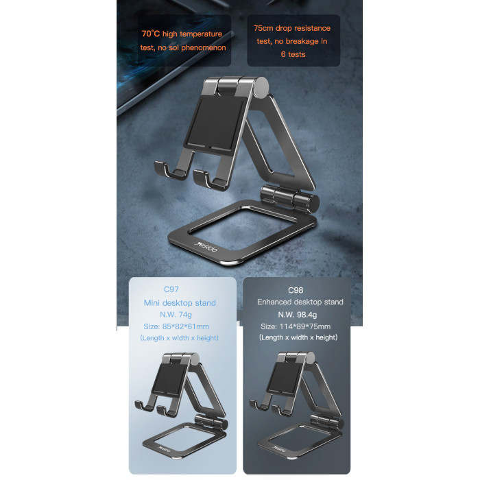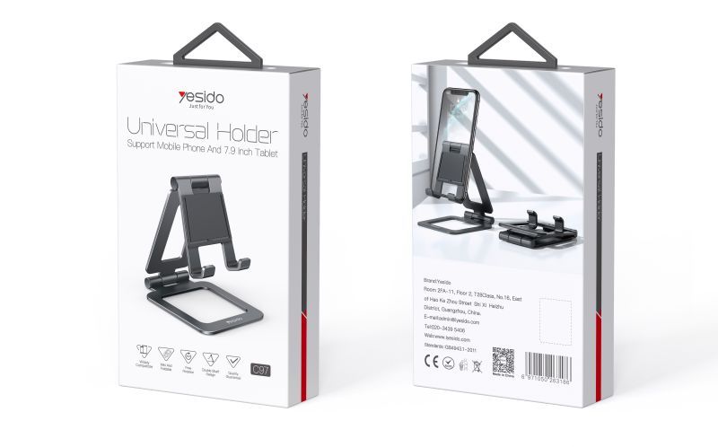 C97 Table Tablet/ Phone HolderYesido C97 Aluminum Alloy 360 Angle Adjustable Telescopic Desk Phone Desktop Stand | Tablet Phone Holder.HPS offer 0.5J/1J/2J/3.5J/4.8J(AC/AC&DC/SOLAR).FeaturesAluminum Alloy Folding holder.Table Using.for mobile / tablet.C97 Table Tablet/ Phone HolderParameterBrand:YesidoFixing method:Table Phone HolderMode:C97Apply to:TableMaterial:ABS + PC +Aluminum AlloyApplicable items:Mobile PhoneOutput:G.W:107GC97 Table Tablet/ Phone HolderVideoProduct Installation Video1.Assemble the holder and the base.2.Assemble the holder on to thetable.3. Put the mobile phone on and start using.Product CompositionTable Phone Holder.C97 Table Tablet/ Phone HolderDetailsFAQ1. what is the delivery time of theC97 Table Tablet/ Phone Holder?Usually, the delivery time will be within 5-7 days.2. What you can do in OEM ?We can help to design the customer’s logo on the products, and help to design the product packaging according to our standard3. How long is your warranty time?from the selling date, last for 1 year.